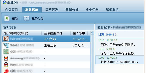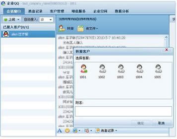 當客戶咨詢時,處于當前會話中的員工如果無法解決或者覺得由另一位員工更能為該客戶服務,則可隨時使用“客戶轉接”功能,可以很方便的由一個工號轉到的另一個工號為此客戶服務。
